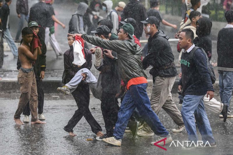 Sejumlah pengunjuk rasa mengangkat rekannya yang cedera saat terjadinya bentrok dengan personel kepolisian di kawasan Jalan Pejompongan, Jakarta, Senin (11/4/2022). ANTARA FOTO/M Risyal Hidayat/aww.