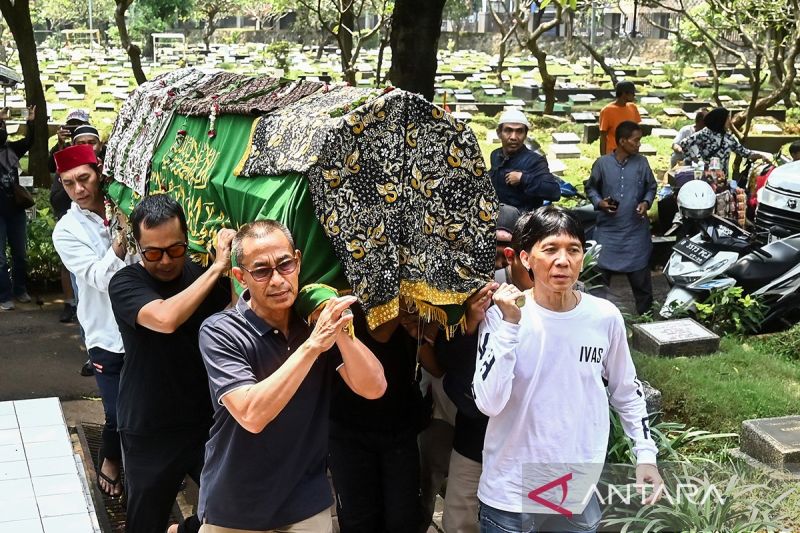 Personel band Slank Bimbim (kanan) bersama para kerabat mengangkat keranda jenazah Bunda Iffet saat pemakaman di TPU Karet Bivak, Jakarta, Minggu (27/4/2025). Bunda Iffet merupakan ibu kandung dari Bimbim meninggal dunia pada usia 87 tahun. ANTARA FOTO/Rivan Awal Lingga/Spt.
