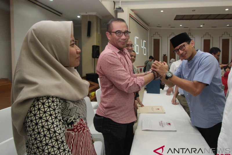 Komisioner KPU Hasyim Asy'ari (kiri) menerima Laporan Awal Dana Kampanye Pemilu 2019 dari Cawapres nomer urut 2 Sandiaga Uno (kanan) bersama tim pemenangan, di KPU, Jakarta, Minggu (23/9/2018). Partai politik peserta Pemilu dan capres-cawapres dijadwalkan menyerahkan Laporan Awal Dana Kampanye (LADK) pada Minggu (23/9) dan apabila tidak menyerahkan LADK akan dikenakan sanksi pembatalan calon. ANTARA FOTO/Reno Esnir.