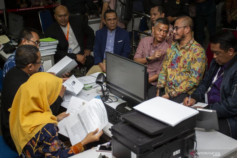 Komisioner KPU Wahyu Setiawan (ketiga kanan) dan Hasyim Asyari (kedua kanan) bersama Tim Kuasa Hukum KPU menyerahkan berkas jawaban gugatan sengketa hasil Pemilu Legislatif (Pileg) di Gedung Mahkamah Konstitusi (MK), Jakarta, Jumat (5/7/2019). Berkas tersebut dipersiapkan untuk menghadapi sidang Perselisihan Hasil Pemilihan Umum (PHPU) Pileg 2019 yang akan dilaksanakan pada Selasa, 9 Juli 2019. ANTARA FOTO/Dhemas Reviyanto/hp.