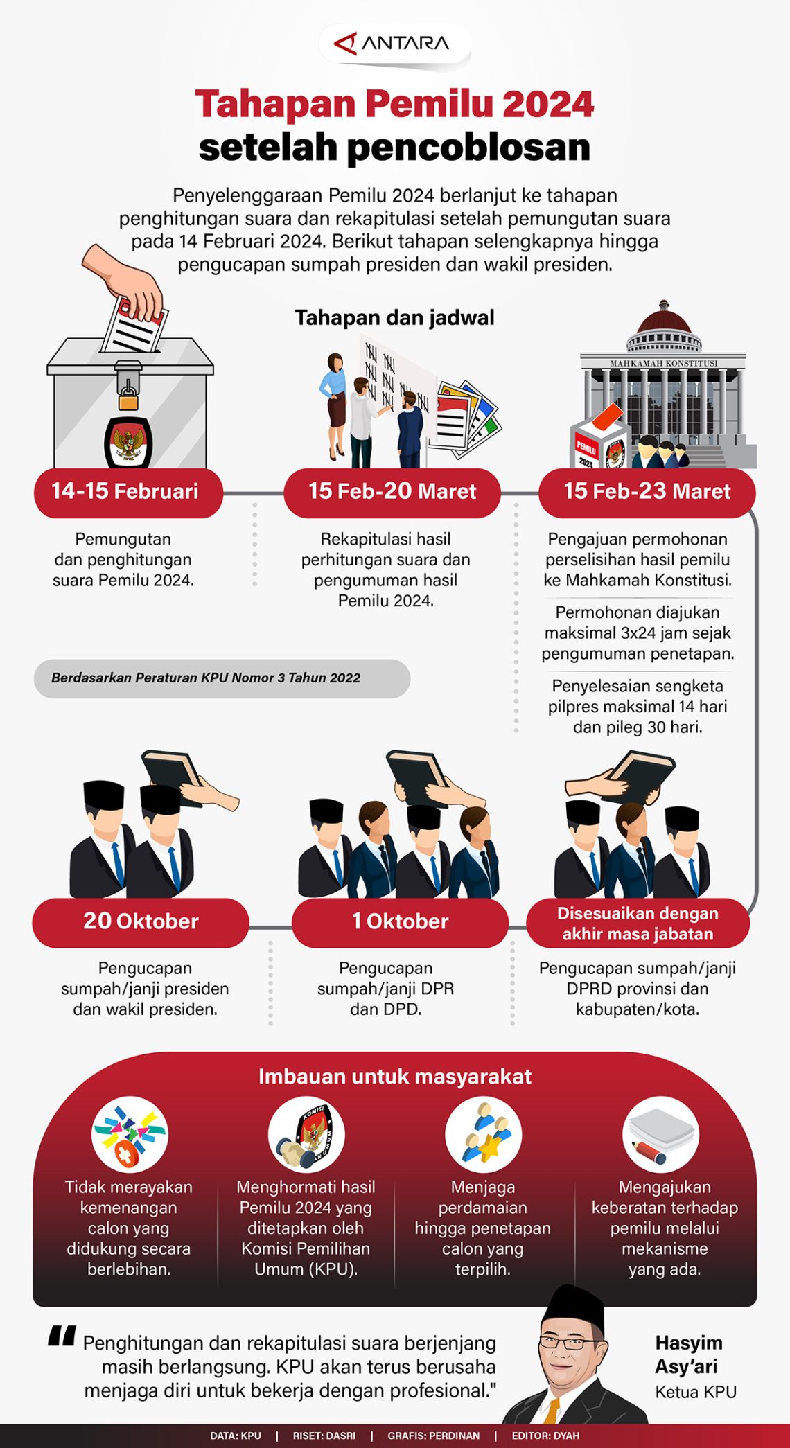 Penyelenggaraan Pemilu 2024 berlanjut ke tahapan penghitungan suara dan rekapitulasi setelah pemungutan suara pada 14 Februari 2024. Berikut tahapan selengkapnya hingga pengucapan sumpah presiden dan wakil presiden.
