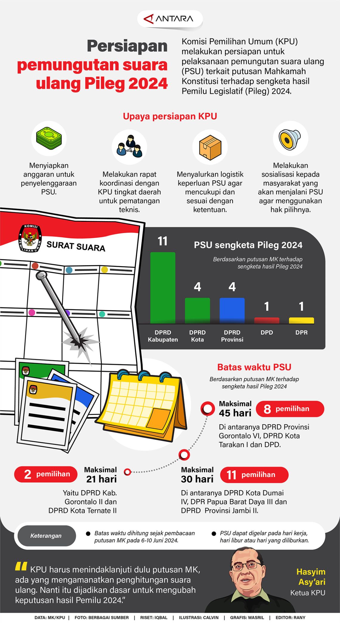 Komisi Pemilihan Umum (KPU) melakukan persiapan untuk pelaksanaan pemungutan suara ulang (PSU) terkait putusan Mahkamah Konstitusi terhadap sengketa hasil Pemilu Legislatif (Pileg) 2024.