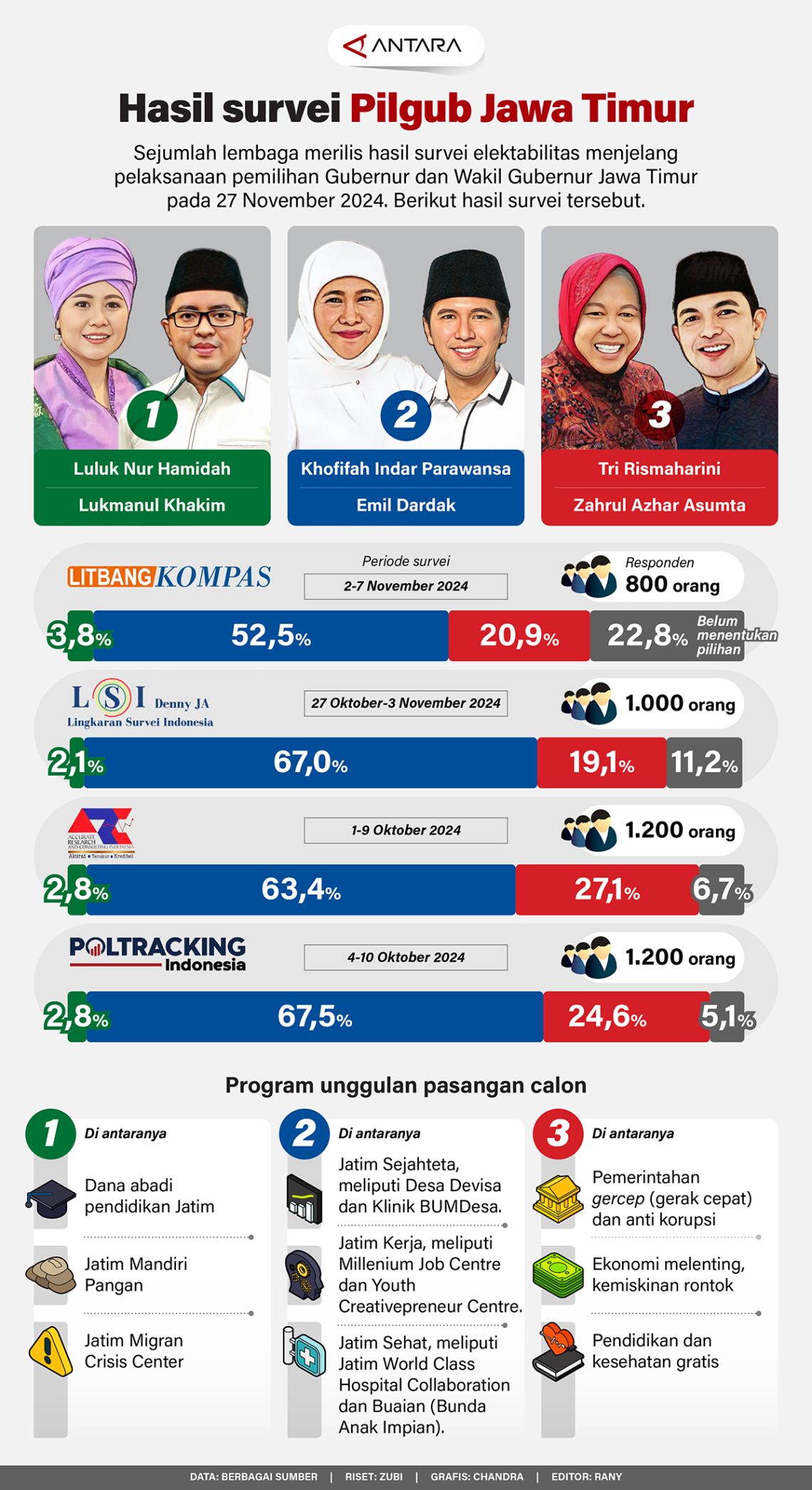 Sejumlah lembaga merilis hasil survei elektabilitas menjelang pelaksanaan pemilihan Gubernur dan Wakil Gubernur Jawa Timur pada 27 November 2024. Berikut hasil survei tersebut.